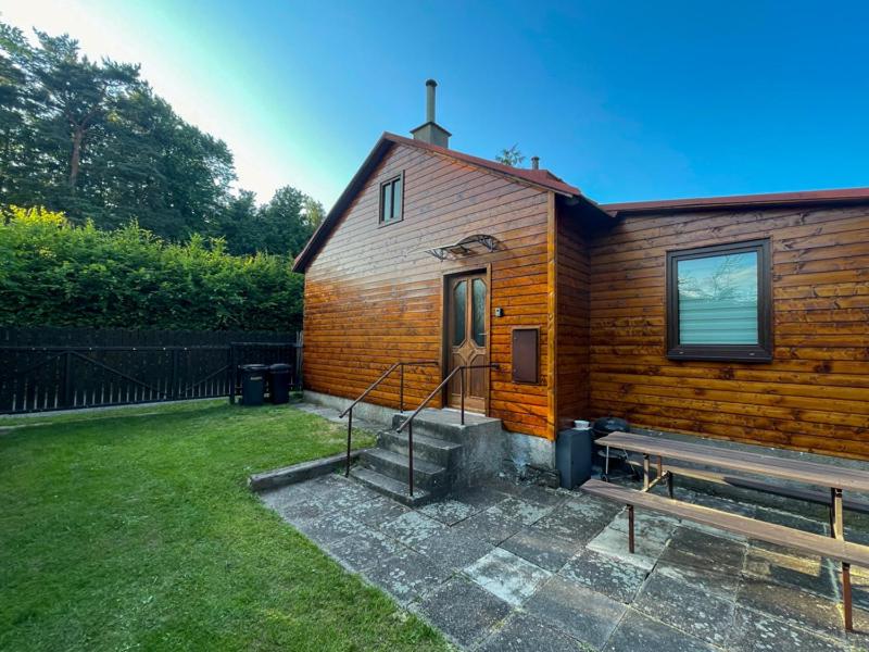 The chalet features 2 separate bedrooms, 1 bathroom, a fully equipped kitchen with a dining area and microwave, and a living room with a flat-screen TV. Guests can enjoy a meal on an outdoor dining area while overlooking the garden views.