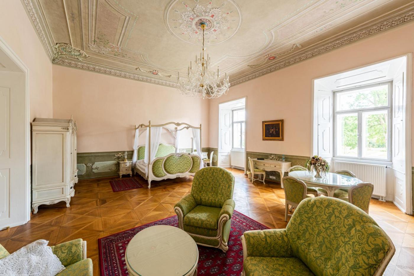 Royal Queen Room. Featuring characteristic decorations on the walls and the ceiling, these very spacious rooms come with a dining table, a seating area with a sofa and stunning views of the chateau park. The bathroom is fitted with a free standing bathtub. ;