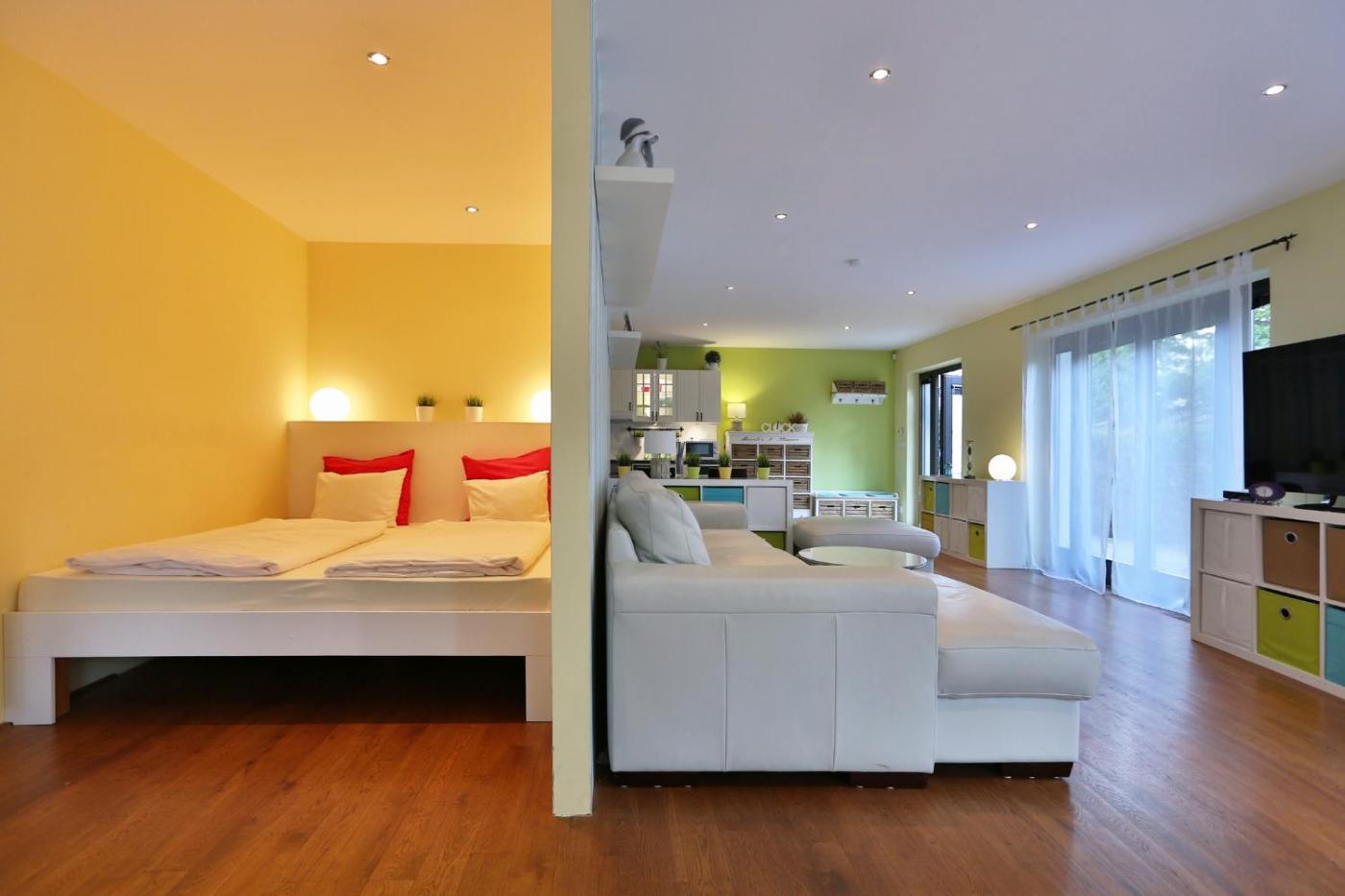 Large Studio. A very spacious studio featuring a sleeping area with a double bed behind a partition and a large sofa bed in the main area with a a flat-screen satellite TV. An equipped kitchen is provided and a private bathroom comes with a bathtub. The studio has a private entrance and a terrace with a French door. ;
