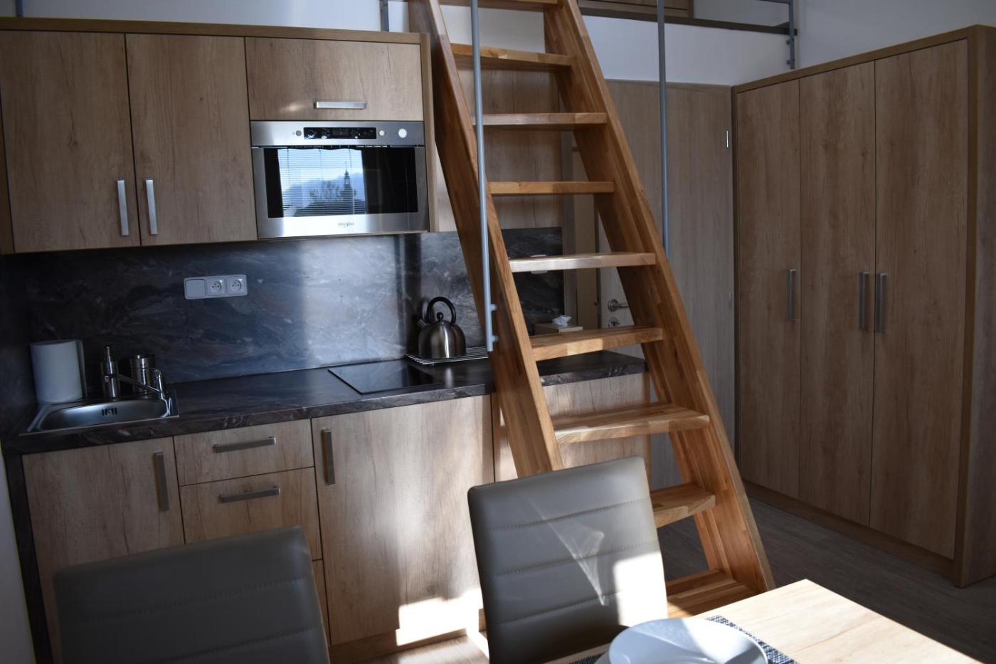 One-Bedroom Apartment. The apartment has 1 bedroom and 1 bathroom with a shower and free toiletries. Guests will find a stovetop, a refrigerator, kitchenware and a microwave in the well-fitted kitchen. The apartment also features a barbecue. The apartment features parquet floors, a seating area with a flat-screen TV, a tea and coffee maker, a wardrobe as well as mountain views. The unit has 3 beds.