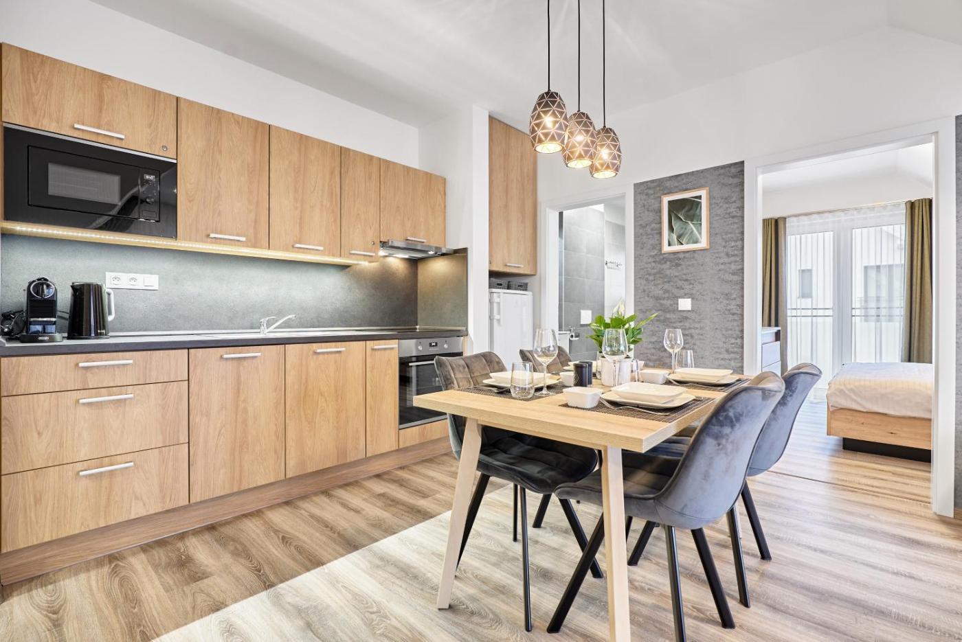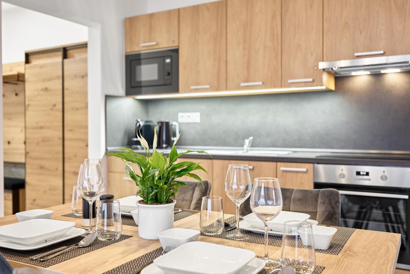 Two-Bedroom Apartment. This apartment comprises 1 living room, 2 separate bedrooms and 1 bathroom with a shower and a hairdryer. Meals can be prepared in the well-fitted kitchenette, which comes with a stovetop, a refrigerator, a dishwasher and kitchenware. The apartment provides a tea and coffee maker, a seating area, a wardrobe, heating, as well as a flat-screen TV. The unit offers 3 beds.