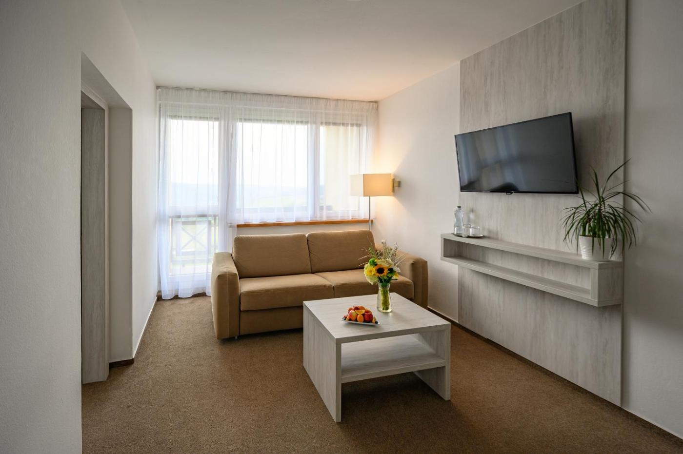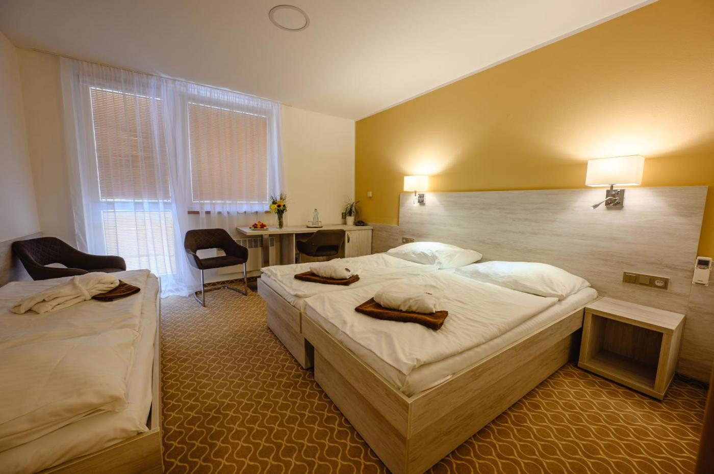 At the hotel, the rooms have a balcony. Selected rooms also boast a kitchenette with a fridge, a microwave and a minibar.rooms in Hotel Vega Luhacovice are fitted with a flat-screen TV and free toiletries.
