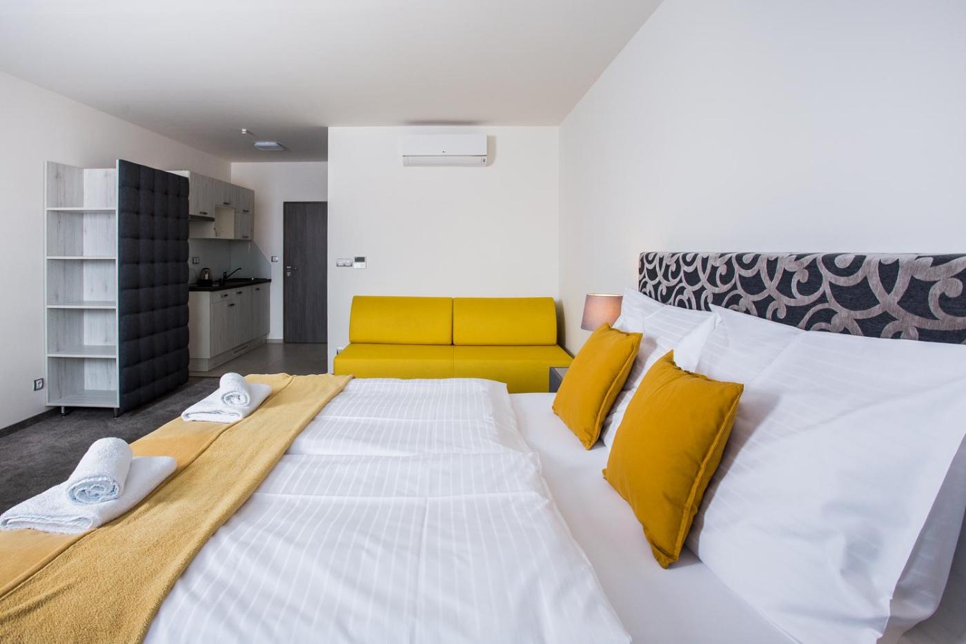 Superior Double Room with Extra Bed. The spacious double room features a private bathroom, air conditioning, soundproof walls, as well as a seating area with a flat-screen TV. Guests can make meals in the kitchenette that is equipped with a stovetop, a refrigerator, kitchenware and an electric kettle. The double room provides a wardrobe, a carpeted floor, heating, as well as a TV. The unit offers 2 beds. ;