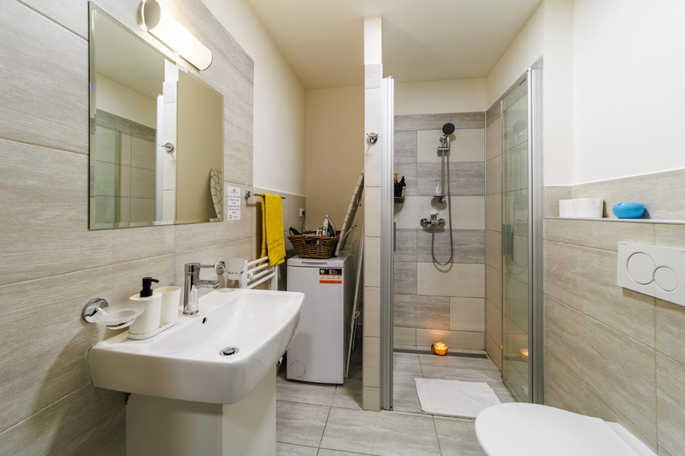 One-Bedroom Apartment. The air-conditioned apartment has 1 bedroom and 1 bathroom with a shower and a hairdryer. In the kitchenette, guests will find a stovetop, a refrigerator, kitchenware and a microwave. The apartment features a washing machine, a coffee machine, heating, a flat-screen TV, as well as city views. The unit has 1 bed.