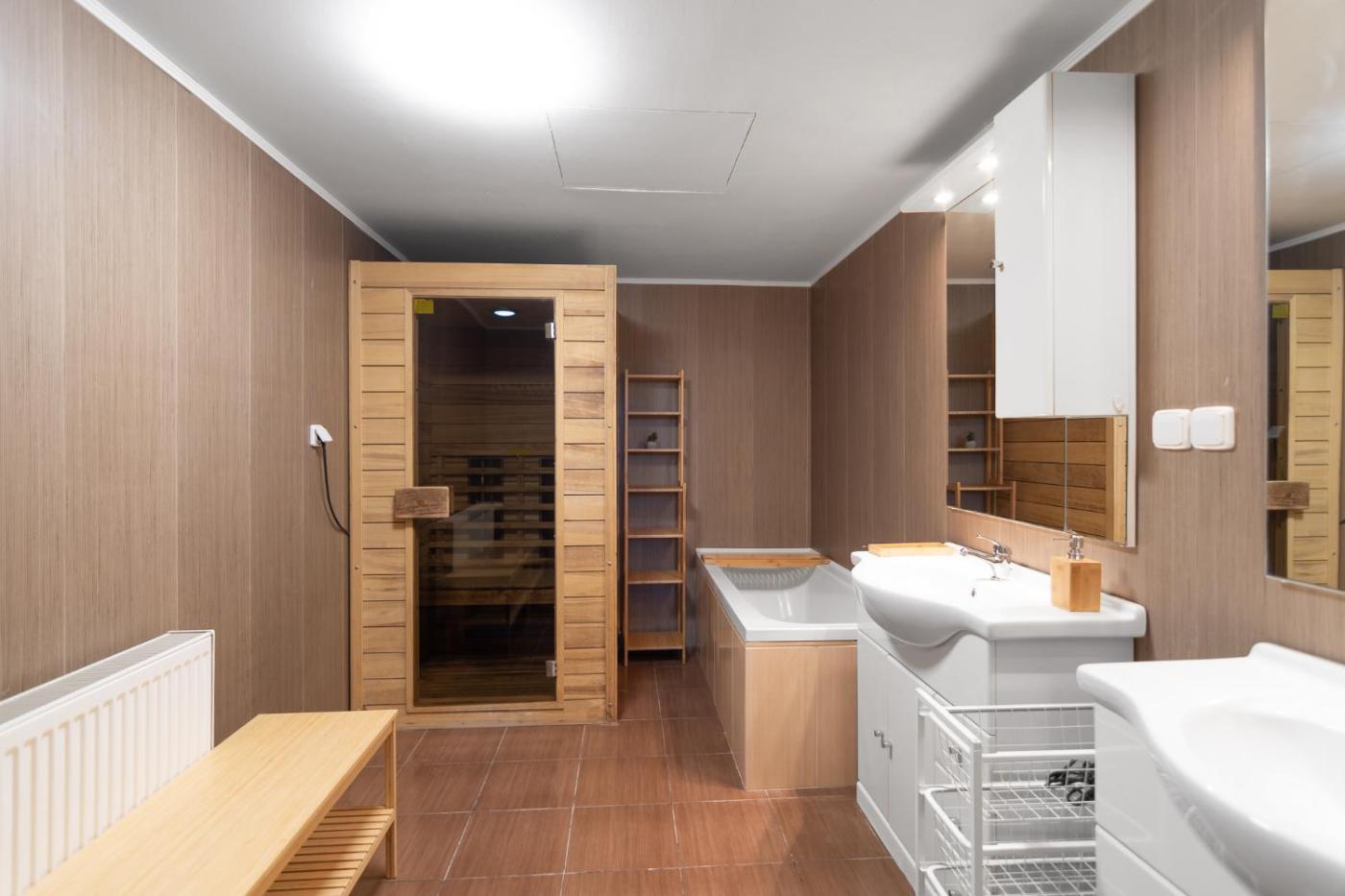 Five-Bedroom House. This apartments standout feature is the sauna. The spacious apartment has 5 bedrooms and 2 bathrooms with a bath and free toiletries. Meals can be prepared in the kitchen, which is fitted with a stovetop, a refrigerator, a dishwasher and kitchenware. The apartment offers a washing machine, a tea and coffee maker, a wardrobe, tumble dryer and a flat-screen TV. The unit has 14 beds.