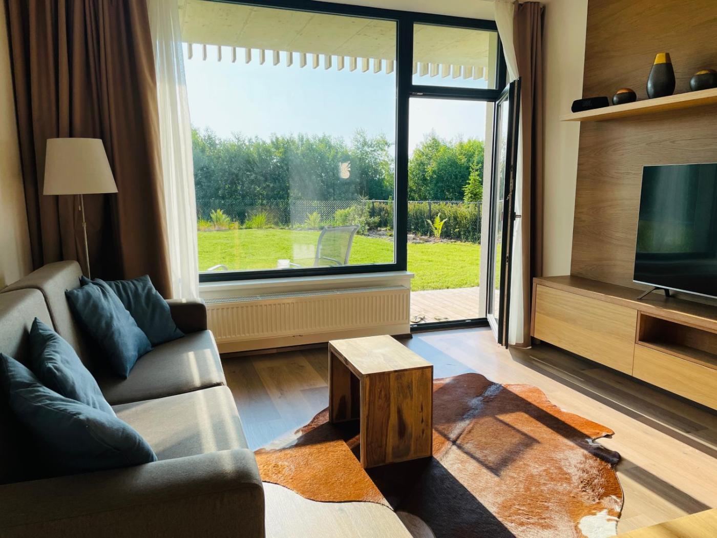 One-Bedroom Apartment. Featuring a private entrance, this apartment comprises 1 living room, 1 separate bedroom and 1 bathroom with a shower and a hairdryer. Guests will find a stovetop, a refrigerator, a dishwasher and kitchenware in the fully equipped kitchenette. The apartment also provides guests with a barbecue. Boasting a terrace with garden views, this apartment also provides a washing machine and a flat-screen TV. The unit offers 2 beds.
